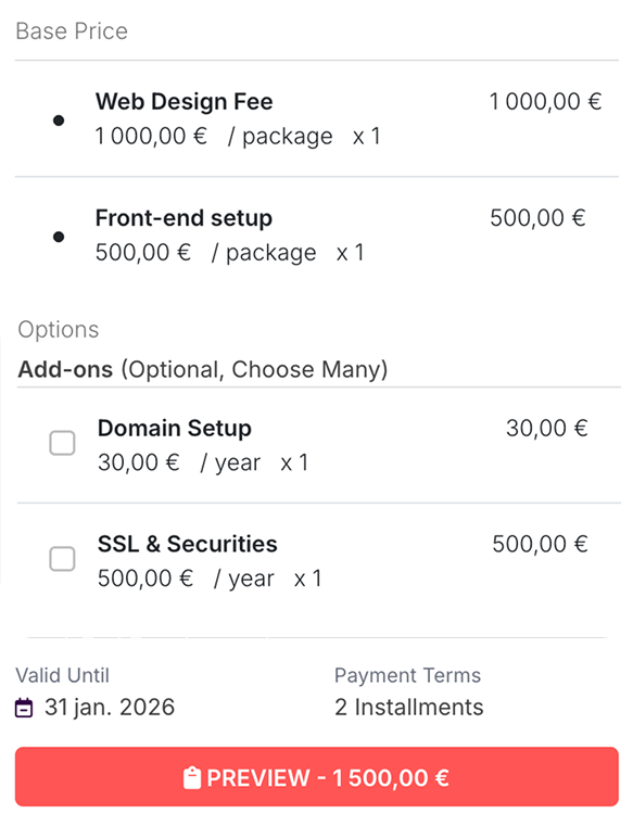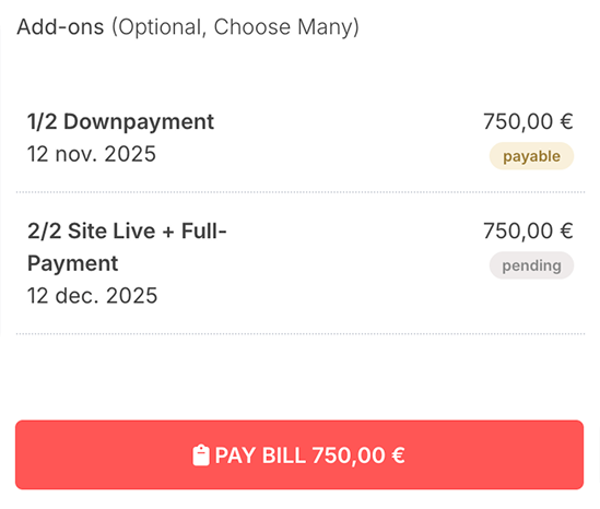 Lightweight & focused. No bloat. Streamlined invoicing with terms (full payment, installments, & subscriptions).
